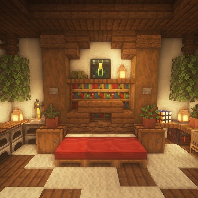 Warmth radiates from the cozy Minecraft interior. Wood dominates, creating a rustic feel. A plush red bed, central to the space, invites relaxation. Flanked by leafy plants, it adds life and color. Well-stocked bookshelves brim with colorful tomes, encouraging exploration and imagination. Soft lighting from lanterns casts a gentle glow, enhancing comfort. Decorative paintings on walls spark creativity.