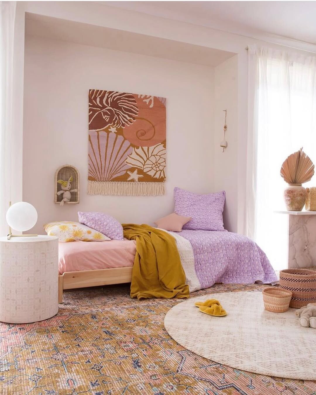 Bedding in lavender and mustard adds warmth. These colors complement each other well, creating a cozy feel. Round woven rug underfoot introduces texture, inviting comfort. Modern lamp on a cylindrical side table provides practical lighting. It blends style with functionality.