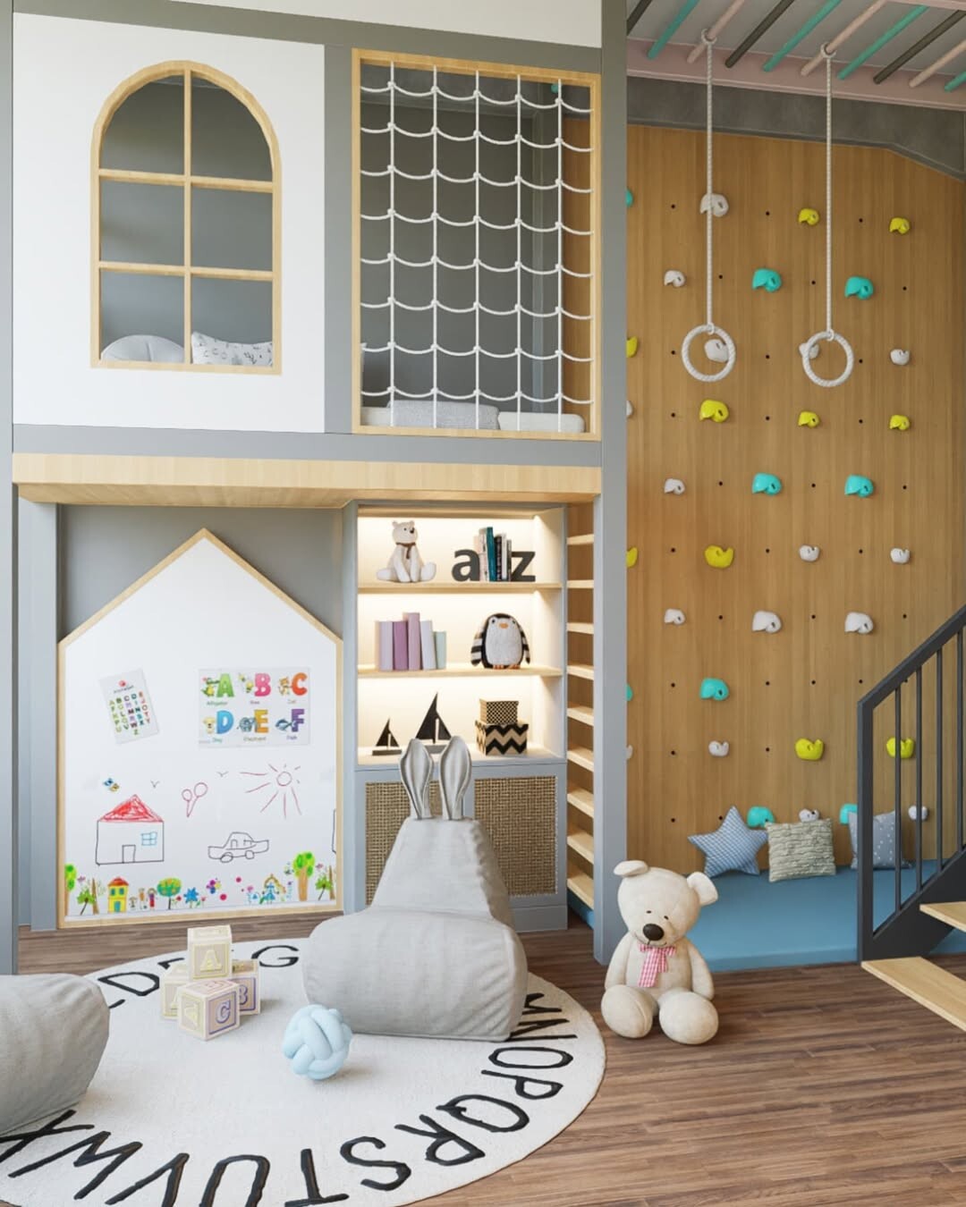 Cozy loft area stands out. A netted sleeping space above invites adventure. Climbing holds on the wall encourage physical activity. Children can play and explore while developing motor skills. Colorful drawing board sparks creativity. It's essential for imaginative play. Bookshelf shaped like a house adds charm and whimsy. Soft bean bags provide comfort. They create a welcoming space for reading or relaxing. Plush teddy bear on a patterned rug adds warmth.