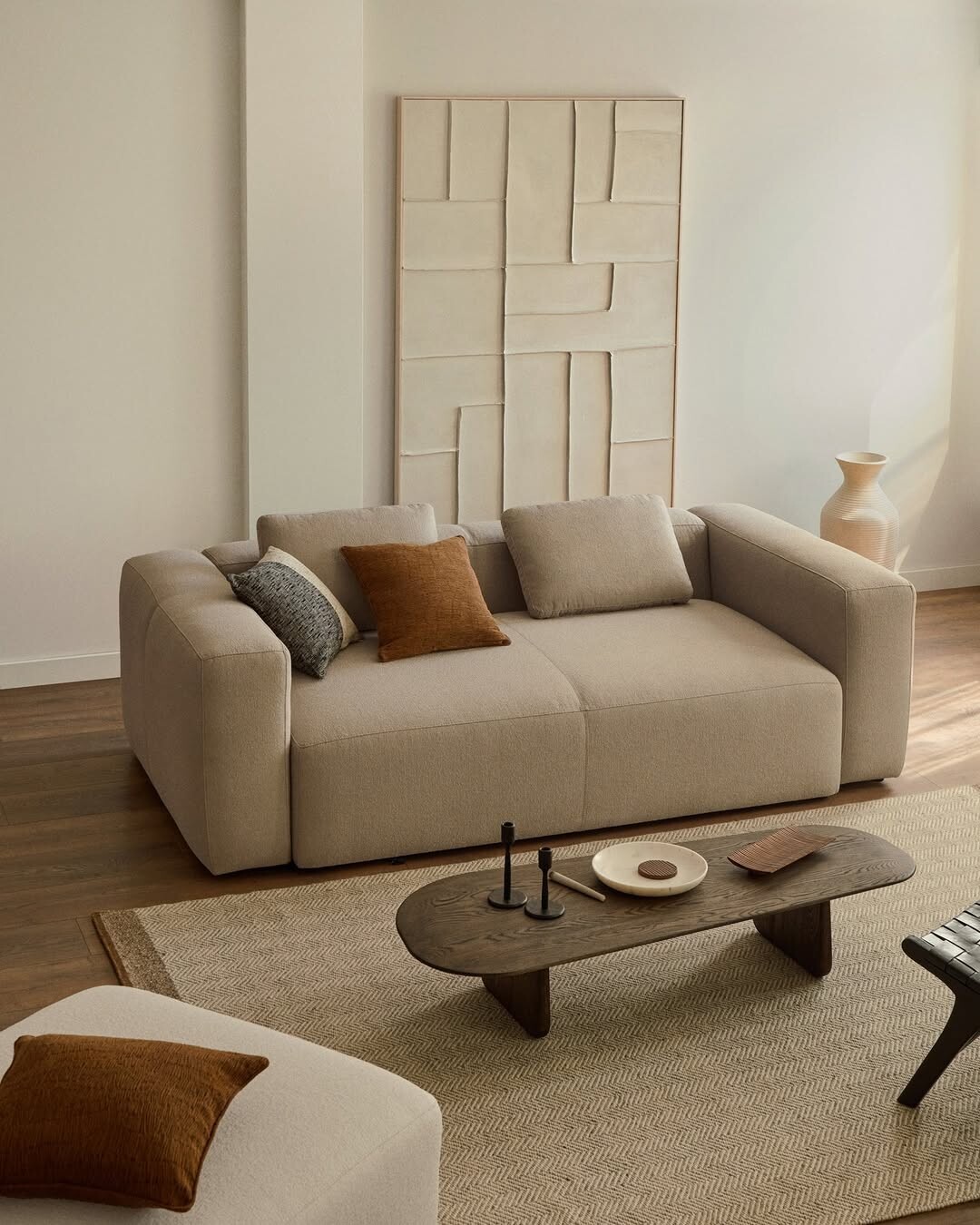 Coffee table catches attention. Its sculptural form draws the eye. Natural materials express warmth. Earthy vase complements the setting. Abstract wall art provides a pop of creativity. Each element tells a story about simplicity and elegance.