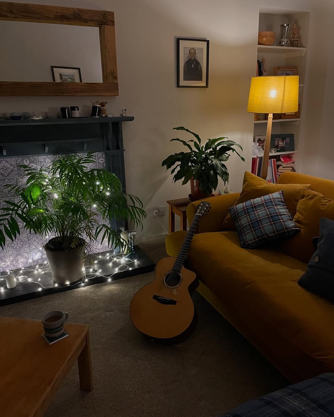 Cozy living room shines with warmth. Yellow sofa stands out, inviting comfort and relaxation. Checked pillow adds texture, creating visual interest. Potted plant, twinkling with fairy lights, brings nature inside. Plants improve air quality and boost mood. Stylish fireplace, framed in wood, offers a focal point. Blue tiles contrast beautifully, enhancing charm. Acoustic guitar leans against the sofa, hinting at creativity and leisure. Music promotes well-being, fostering connections. Small coffee cup on wooden table suggests shared moments over warm drinks. Each element contributes to a welcoming atmosphere. Together, these details illustrate themes of comfort, creativity, and connection. Spaces like this encourage relaxation and togetherness. Ideal for unwinding after a long day.