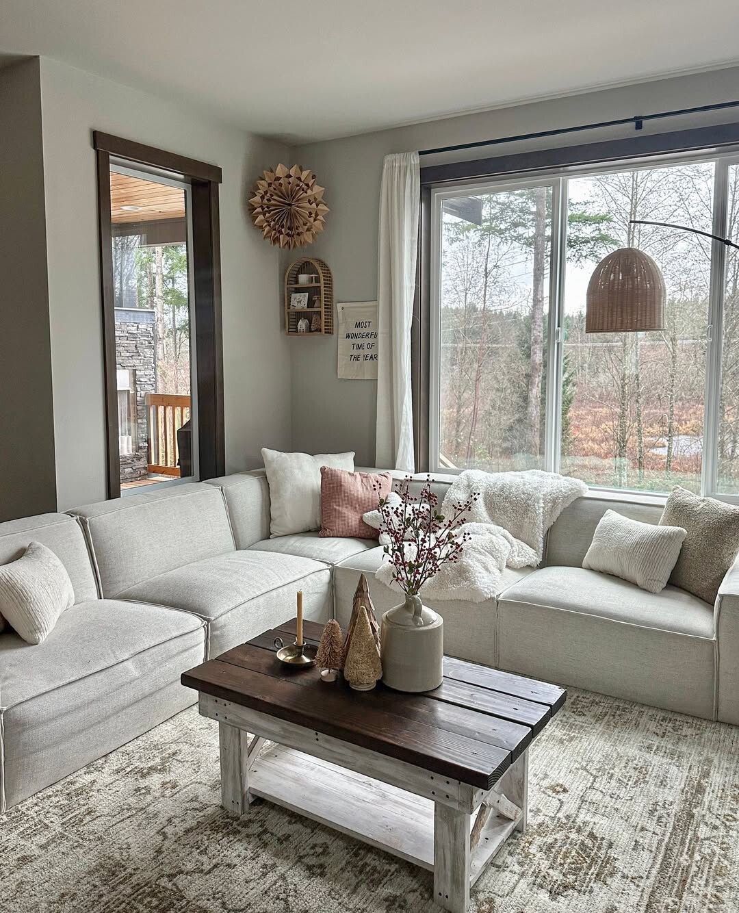 Cozy, modern living room. Light-colored sectional sofa. Plush and inviting. Decorative pillows add charm. Rustic wooden coffee table stands out. Elegance in simplicity. Candles flicker softly, creating warmth. Vases bring life, holding fresh blooms. Large windows frame a serene view. Natural light floods in, enhancing comfort.