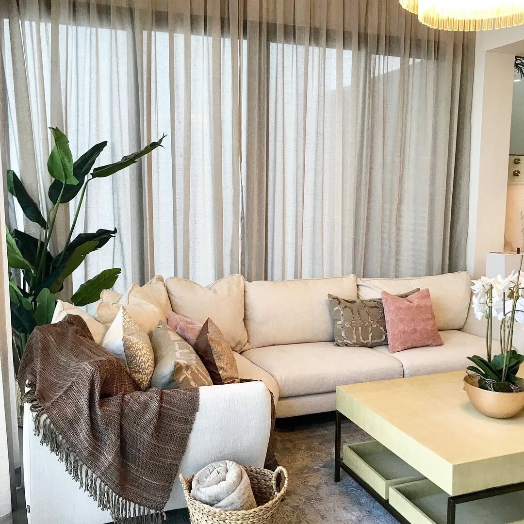 Cozy and elegant living room. Large white sectional sofa catches the eye. Cushions add color and comfort. Central light coffee table invites gathering. Textured rug brings warmth underfoot. Green plants in corners add life and freshness. Natural light streams through sheer curtains.