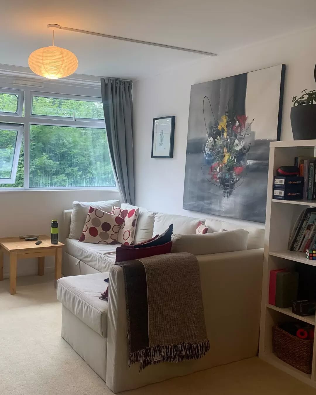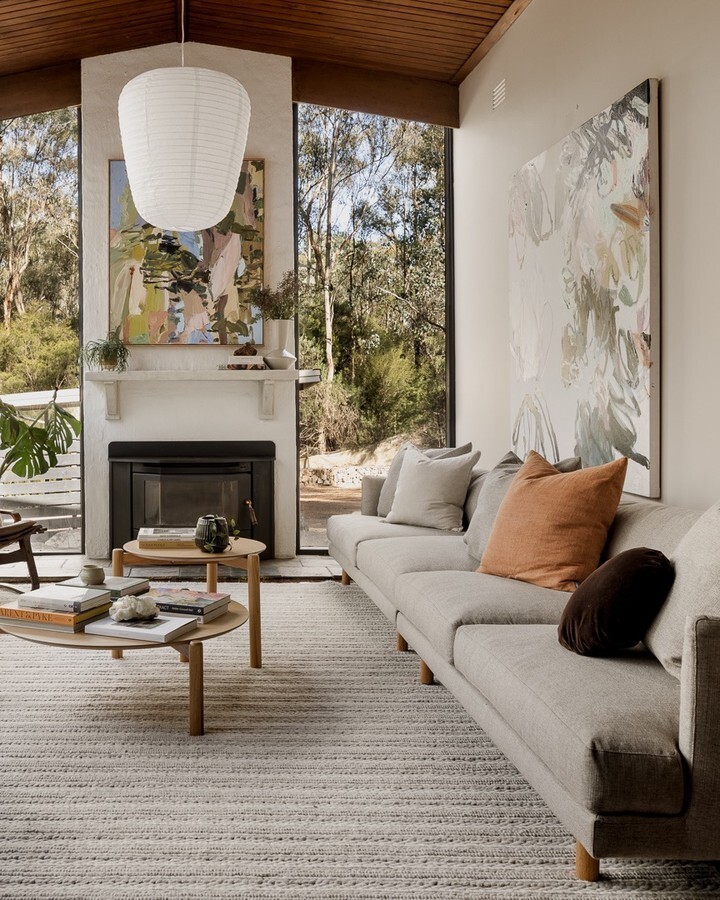 Stylish living room. Light gray sofa stands out. Accent pillows add warmth. Colors evoke comfort. Round wooden coffee table holds books, decor. Simple yet effective design. Large windows invite outside light. Lush greenery visible. Nature enhances atmosphere. Two abstract art pieces on walls create interest. They stimulate thought and conversation. Modern pendant light adds elegance, illuminating space. All elements combine for a serene feel. This room embodies contemporary design principles. It emphasizes comfort and functionality. Sustainable materials shine through, like wood. Nature connection fosters calmness. A perfect blend of style and peace. Spaces like these promote well-being. They invite relaxation, making them vital in homes today.