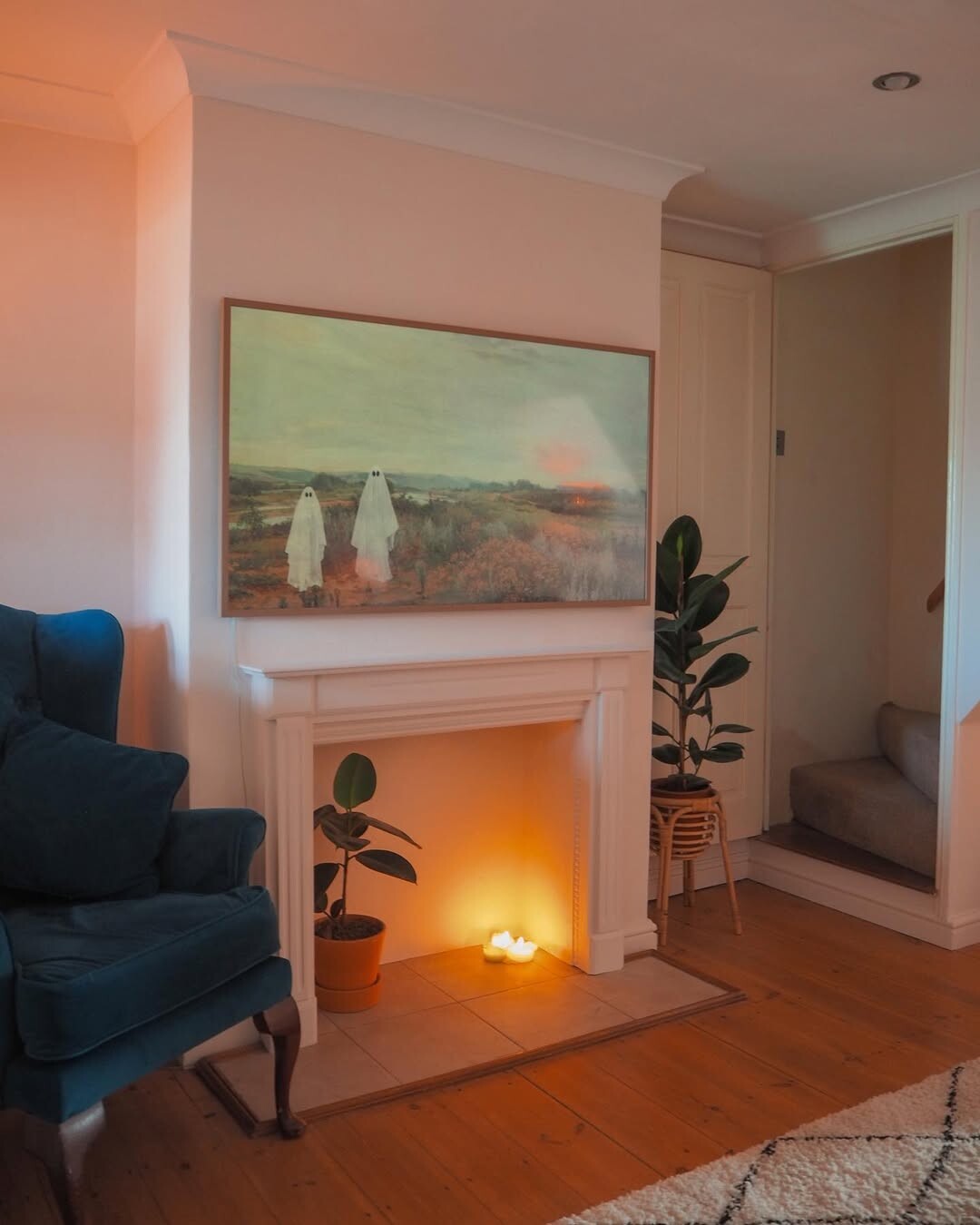 Cozy living rooms often blend comfort with style. Plush blue armchair invites relaxation, a perfect spot for reading or reflection. Minimalist fireplace adds warmth. Its simplicity draws focus to serene painting. Two ghostly figures in a landscape evoke mystery. Art sparks conversation, introducing emotional depth.