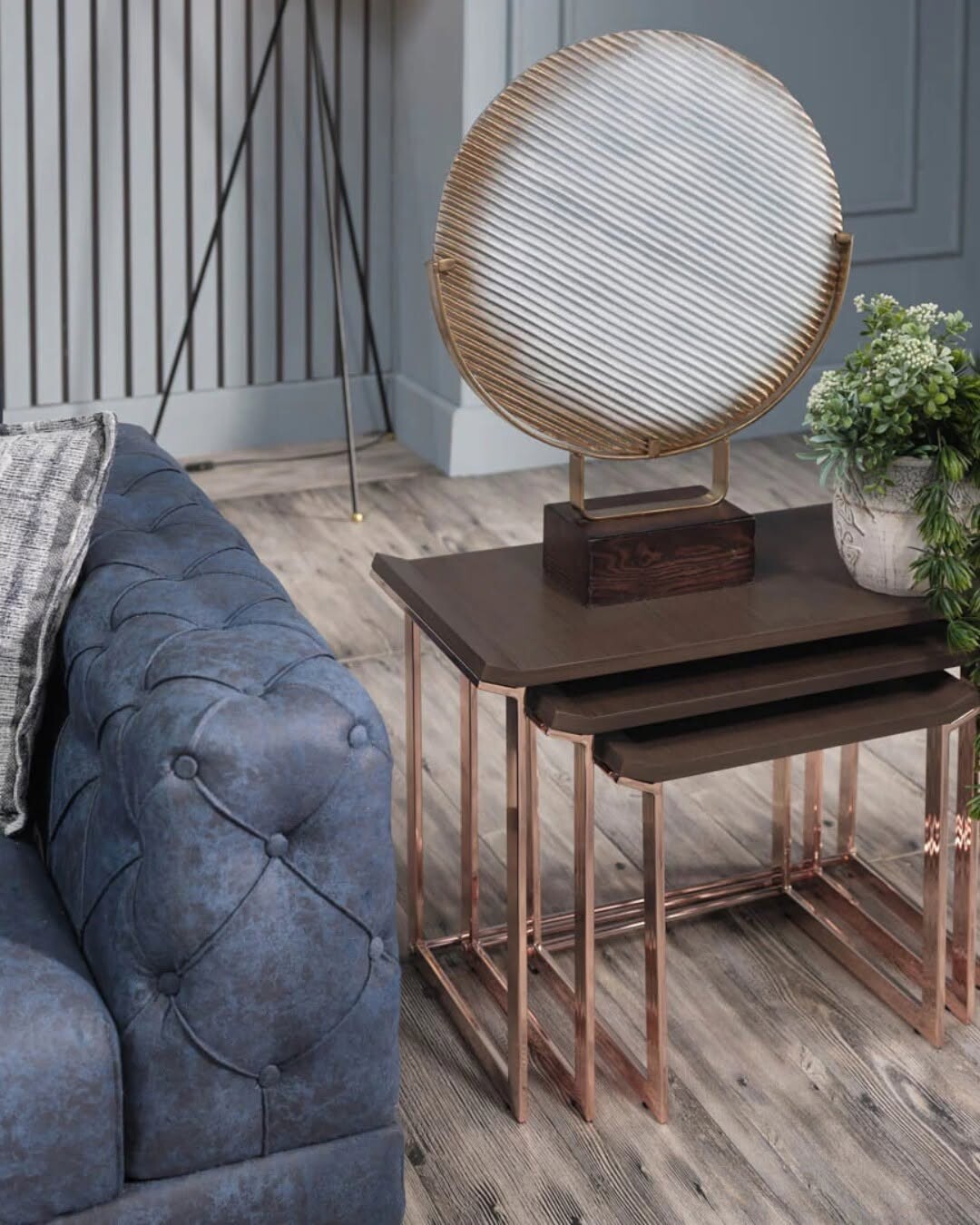 Cozy living room shines. Tufted blue sofa stands out. Its color adds warmth. Nesting tables with copper legs bring a modern touch. Dark wood surfaces balance the brightness. Artistic piece resembles a fan or mirror. This adds flair and depth.