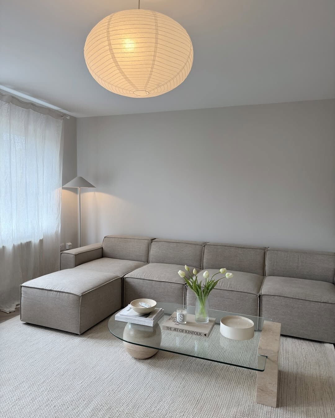 A minimalist living room shines with soft, neutral colors. Gray sectional sofa invites comfort. It’s a perfect spot for relaxation. Glass coffee table adds elegance. Fresh tulips in a vase bring life to the space. Decorative items on the table create interest.