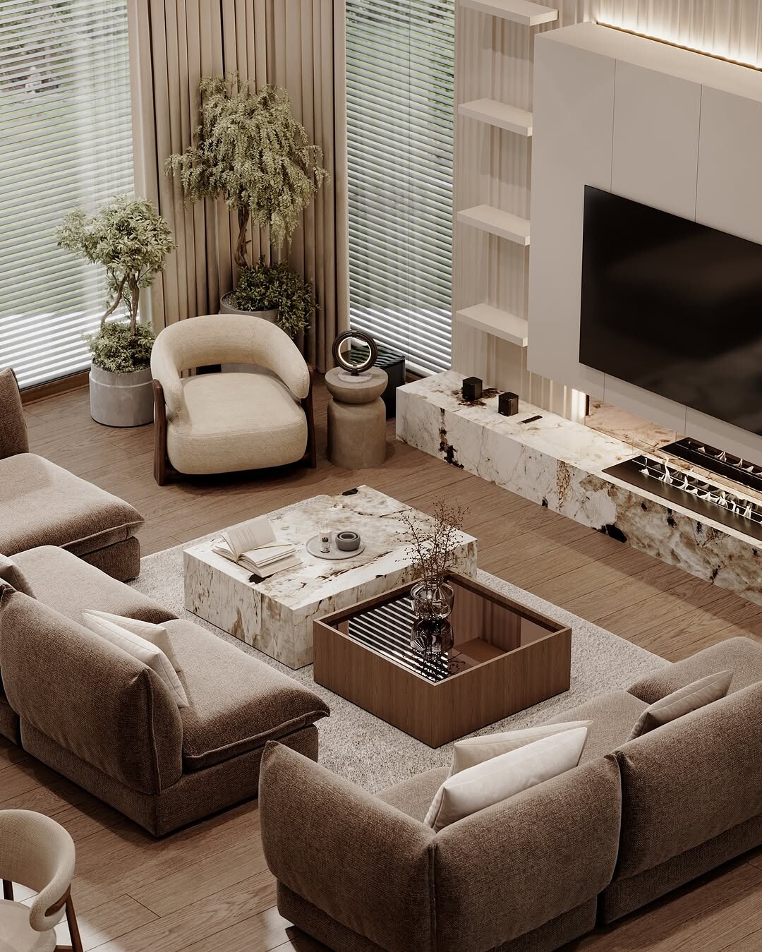 Modern living room design shines here. Plush, brown sofas invite relaxation. Marble coffee table adds elegance. Cozy armchair balances minimalism. Green indoor plants breathe life. They improve air quality and mood. Entertainment unit stands sleek, showcasing a large flat-screen TV. Soft, ambient lighting creates warmth. This design reflects a trend toward comfort and style. Spaces like these blend function with aesthetics.