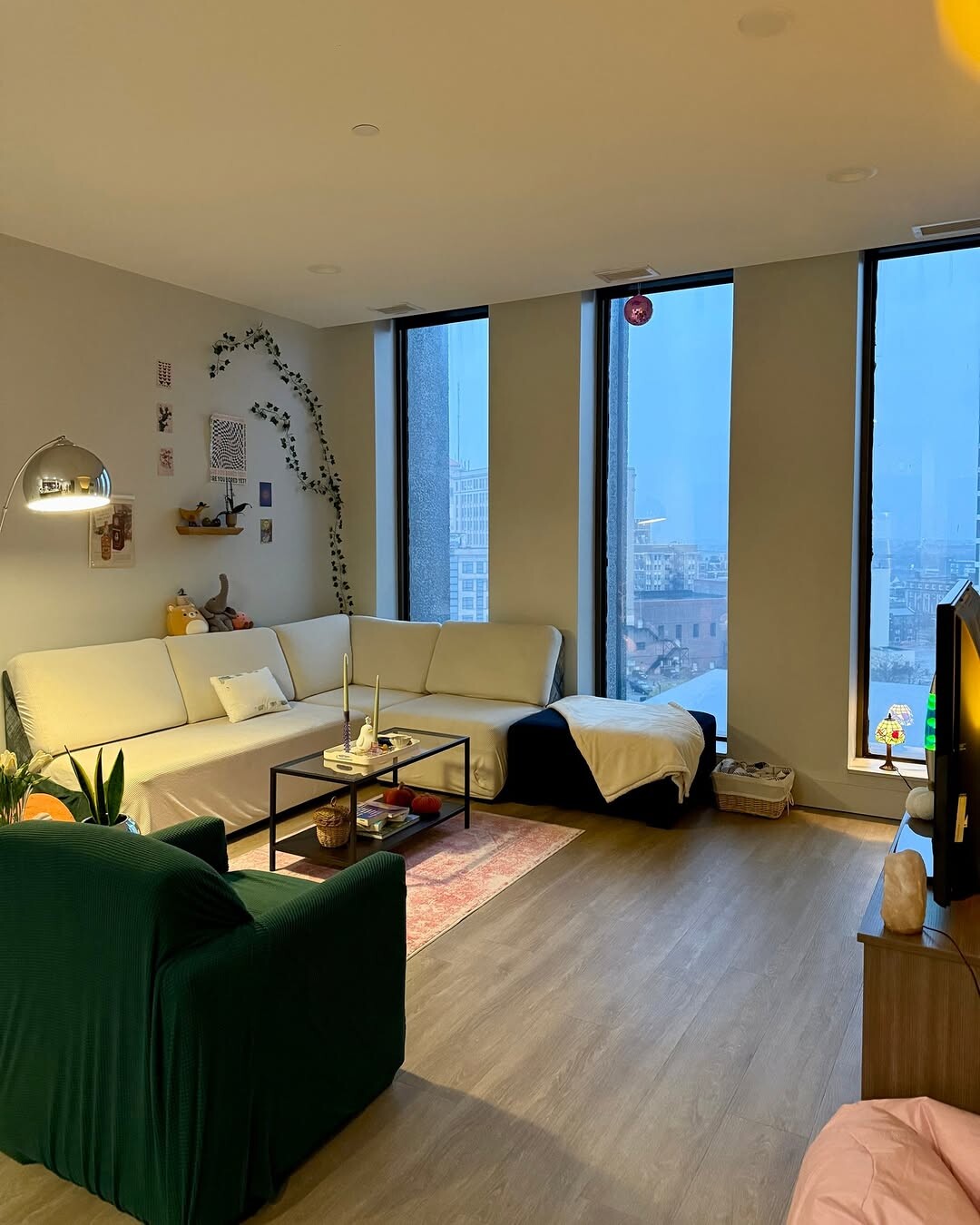 Cozy living room. Modern design shines through. White sectional sofa stands out. It invites comfort. Black coffee table adds contrast. Green chair pops with color. Large windows frame a foggy city view. Urban landscapes blend with homey vibes. Natural light floods in. Plants breathe life into the space. Wall art personalizes the area. Each element reflects style and personality.