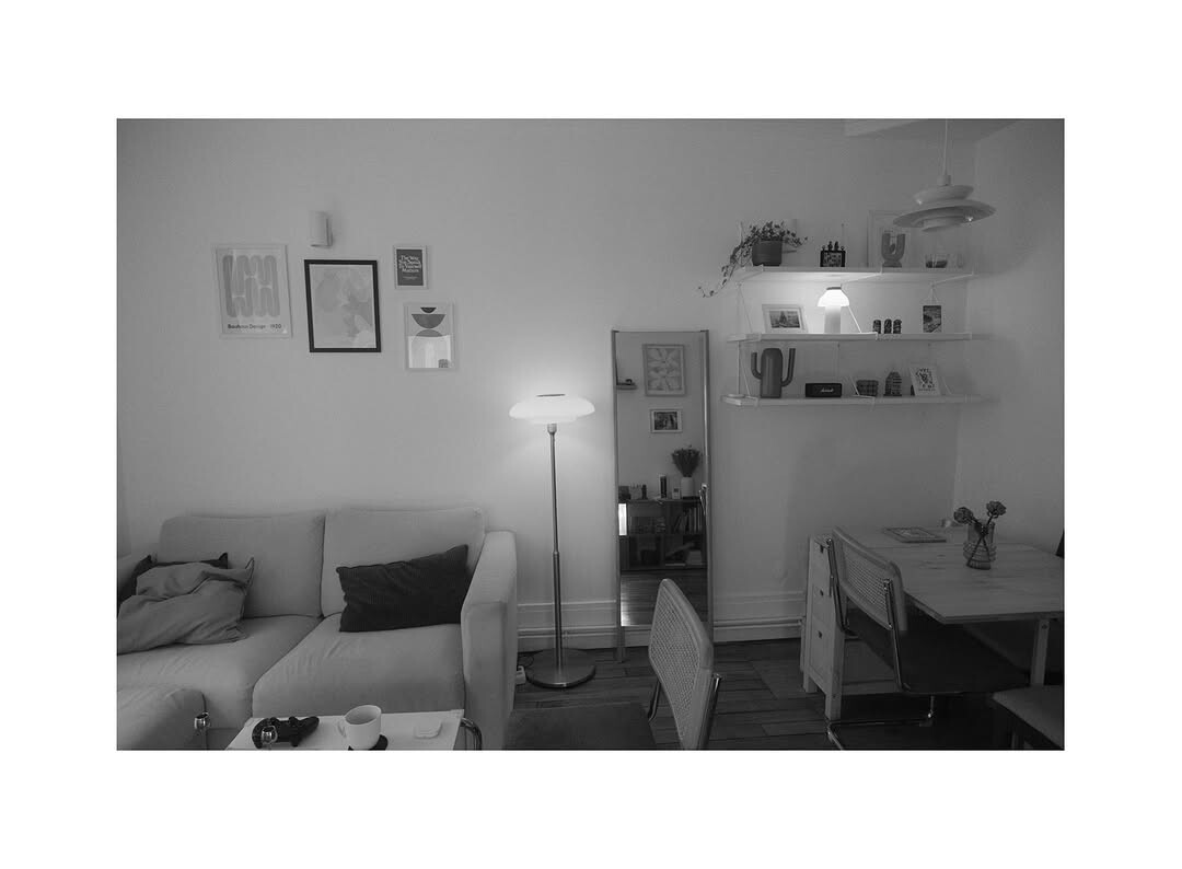 Cozy living space. Black and white charm. Light-colored sofa stands out. Cushions add comfort. Floor lamp provides soft light. Minimalist dining area shows simplicity. Simple chair and table emphasize functionality. Walls filled with framed art create interest. Shelves display decorative items, bringing personality.