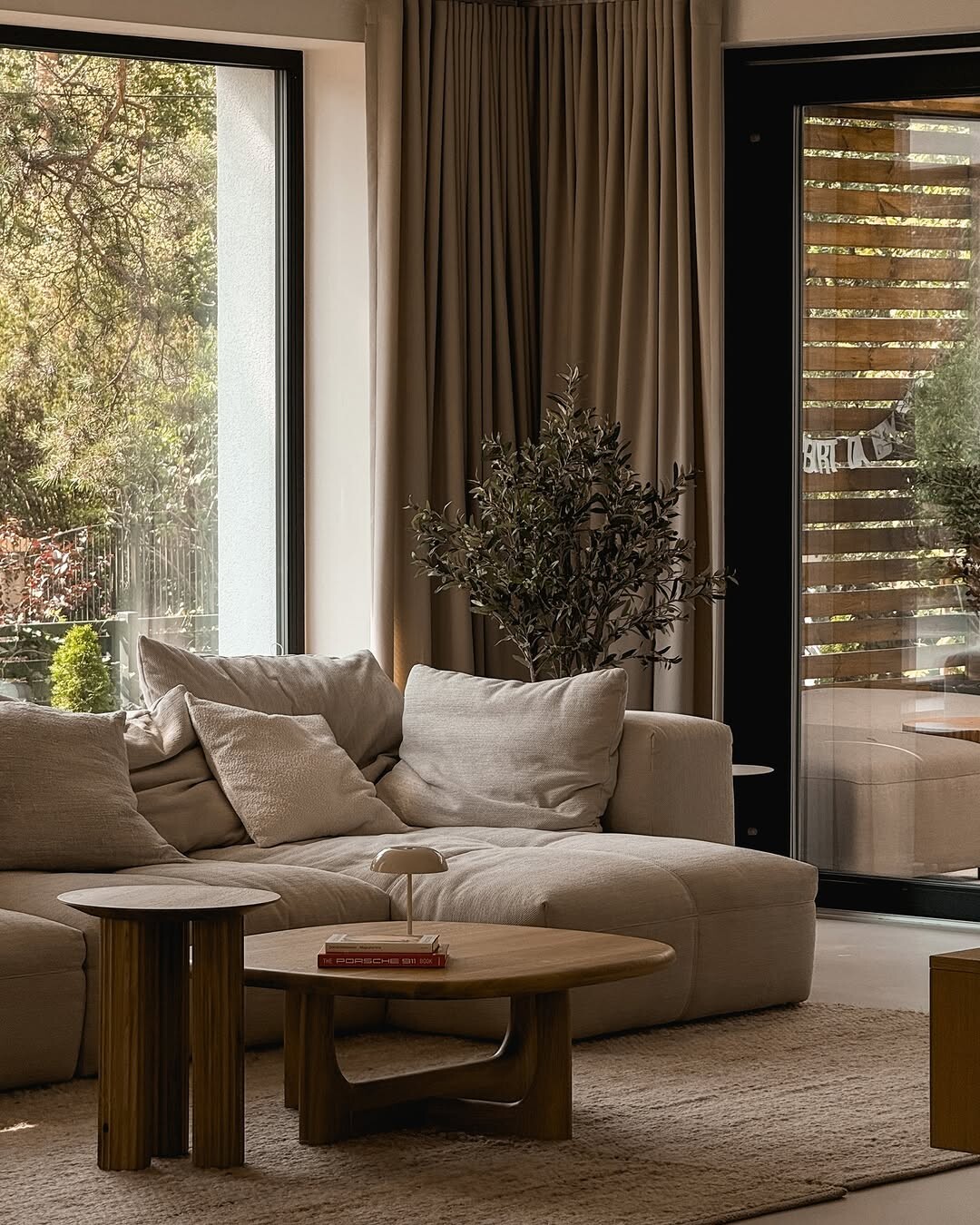 Cozy living rooms create warmth. Soft, light-toned sectional sofas invite relaxation. Decorative pillows add color and comfort. Minimalist wooden coffee tables keep things tidy. Large windows let in sunlight, brightening the space. Soft curtains enhance softness, adding texture. Nature outside offers a peaceful view, connecting indoors with outdoors.