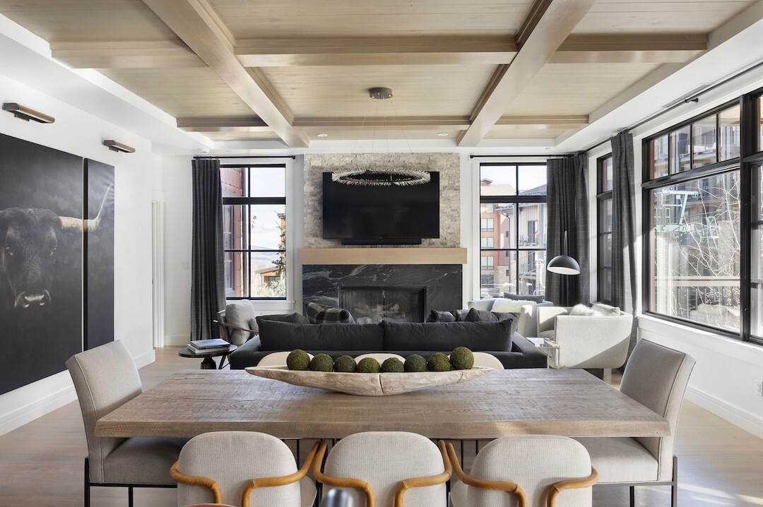 Space feels open, airy. Light wood coffered ceiling adds elegance. Large windows invite sunlight. Natural light boosts mood. Cozy stone fireplace anchors room. It offers warmth and comfort. Mounted television above creates a focal point. Black sofa with plush cushions invites relaxation. Stylish dining table stands out. Decorative bowl of green spheres adds a pop of color.