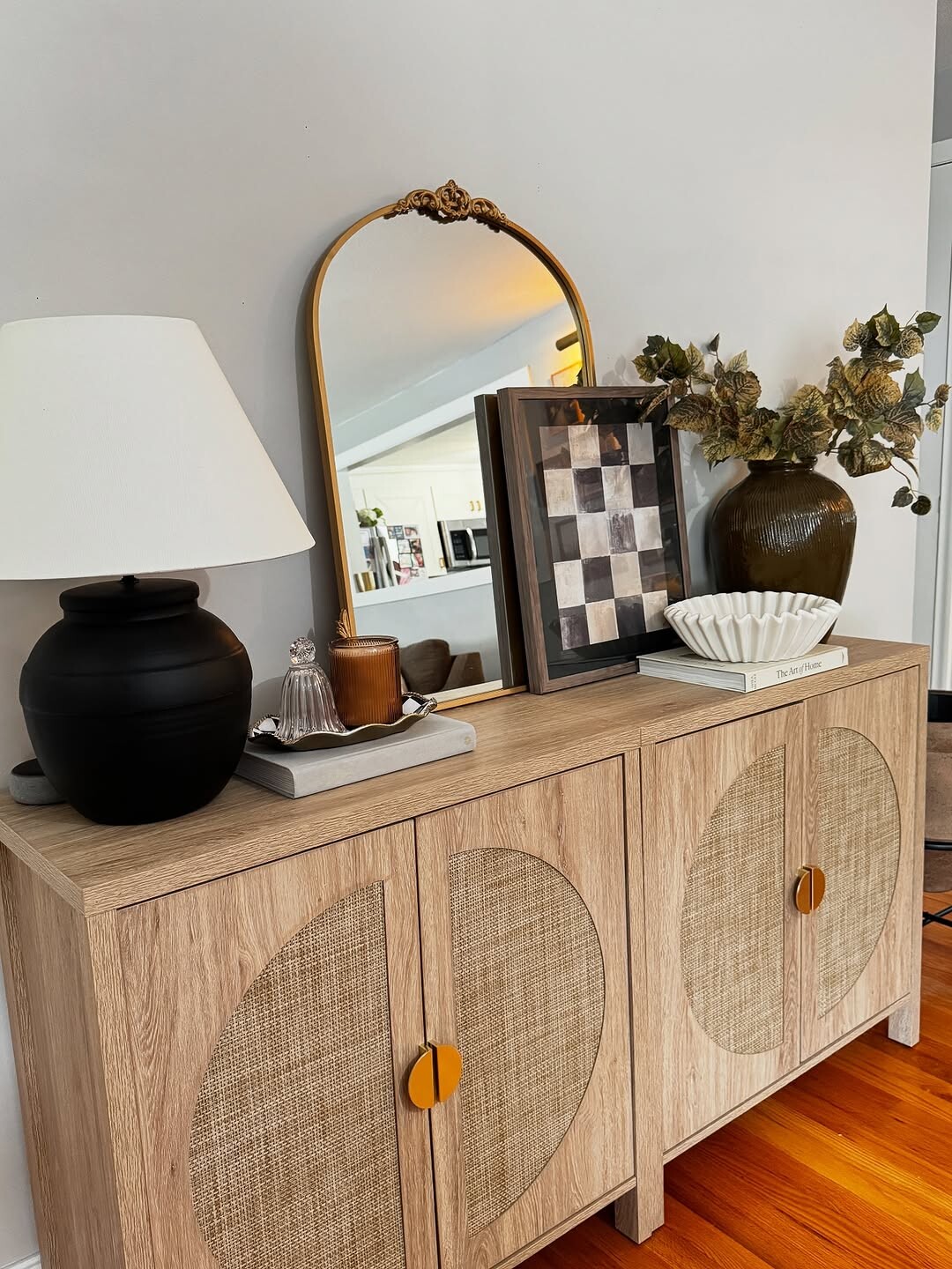 Stylish wooden sideboard stands out. Curved, woven-textured cabinet doors add depth. White lampshade glows softly, creating warmth. Textured black vase contrasts nicely. Decorative checkerboard artwork introduces a playful element. Scalloped dish adds a hint of elegance.