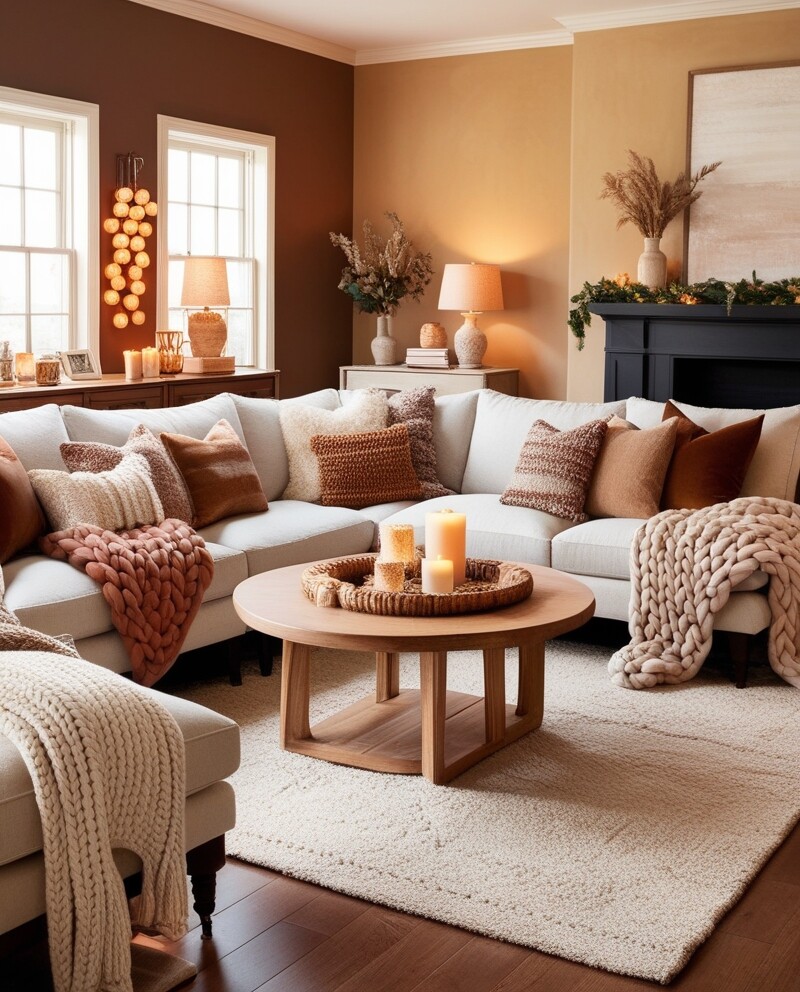 Cozy living rooms create warmth and comfort. Plush white sectional invites relaxation. Textured throws and decorative pillows add depth. Earthy tones connect to nature, promoting calm. Round wooden coffee table stands as a centerpiece. Candles offer soft light, enhancing tranquility. Natural decor brings life indoors, fostering a serene atmosphere. Stylish fireplace adds character, while glowing lamps provide gentle illumination. Rich brown and warm beige walls create a welcoming backdrop. These colors evoke feelings of safety and peace. Overall, this space embodies the essence of home. It illustrates how thoughtful design can enhance well-being. Comfort and style work together here, making it a perfect retreat. Such spaces nurture connections among family and friends.