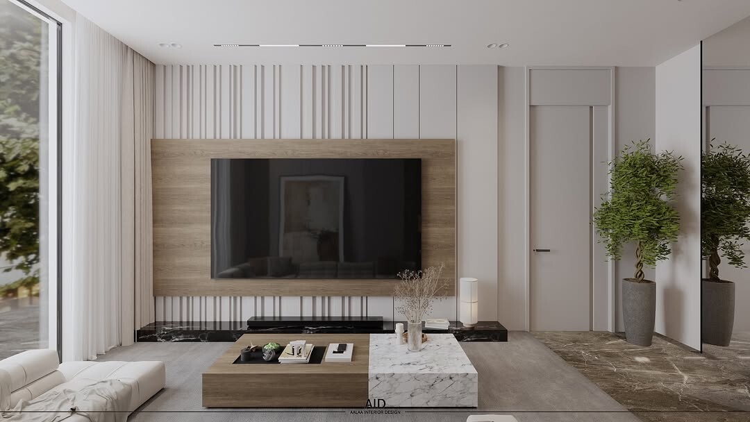 The flat-screen TV is a focal point. Mounted on a stylish wooden panel, it blends technology with design. A sleek marble coffee table adds elegance. Decorative items on it bring personality to the room. Indoor plants provide a touch of nature, improving air quality and mood.