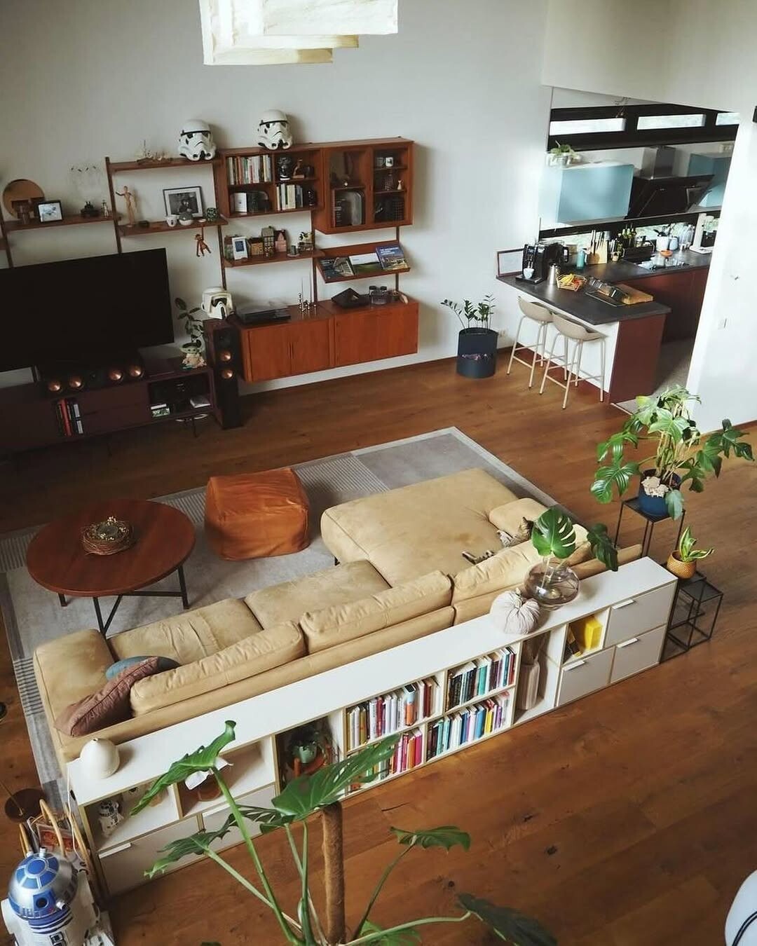 Cozy and inviting. Modern living room shines with comfort and style. Beige sectional sofa anchors space, offering ample seating. Bookcase divider adds functionality. It separates areas without closing them off. Round wooden coffee table brings warmth, a perfect spot for drinks or games.