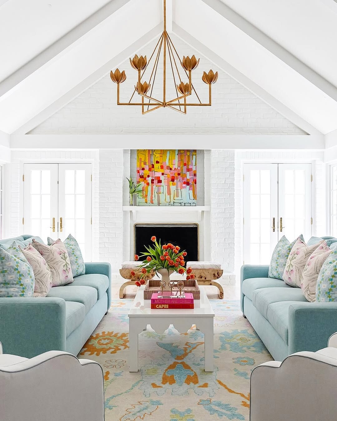 Bright spaces. Soft colors. This living room shines with warmth. Two blue sofas sit comfortably, inviting relaxation. Patterns on pillows add a playful touch. A white coffee table anchors the scene, balancing colors and shapes. Above, an abstract painting bursts with energy, drawing eyes. It contrasts nicely with classic brick of the fireplace.