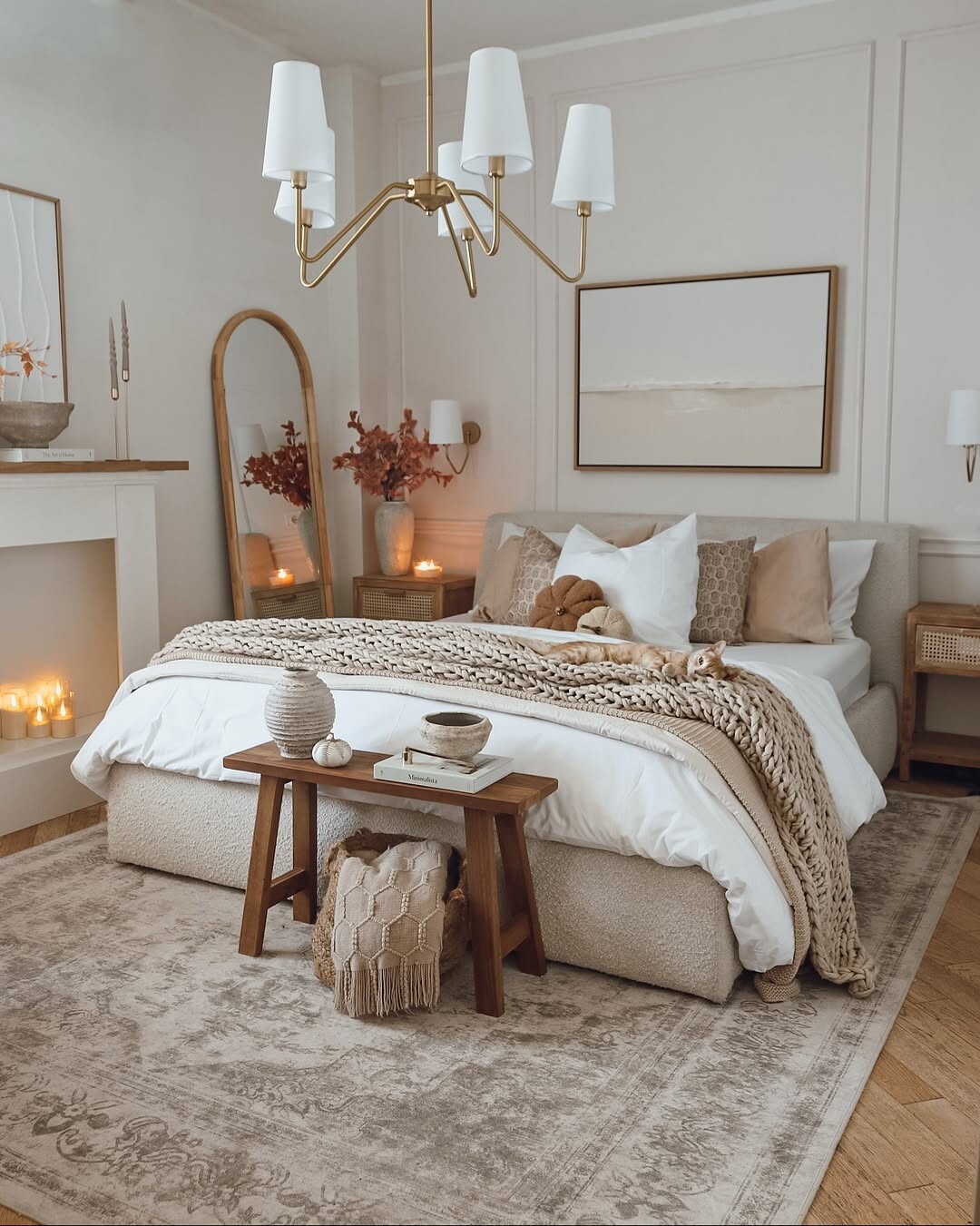 Cozy bedrooms create comfort and warmth. Neutral colors calm the mind. Large beds invite relaxation. Soft pillows and chunky throws add coziness. A wooden bedside table holds decorative items. Small plants bring life to the space. Stylish mirrors reflect light, enhancing brightness. Candlelight offers warmth and intimacy, perfect for winding down. Framed artwork personalizes the room, showing tastes and interests. A chandelier adds elegance, drawing the eye upward. Plush area rugs provide texture, making the space feel inviting. Each element works together, creating a serene atmosphere. This design reflects the importance of comfort in personal spaces. It’s not just about looks; it’s about feeling at home.