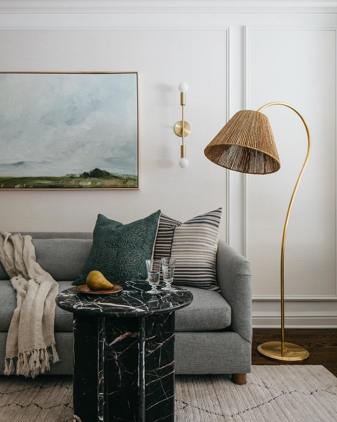 Cozy living room. Soft gray sofa. Textured pillows add warmth. Black marble side table shines. A pear and two glasses sit atop, inviting relaxation. Chic woven lamp stands tall, its gold base curves elegantly. Modern landscape painting on the wall introduces art into space. Neutral-toned woven blanket drapes across the sofa, suggesting comfort and style.