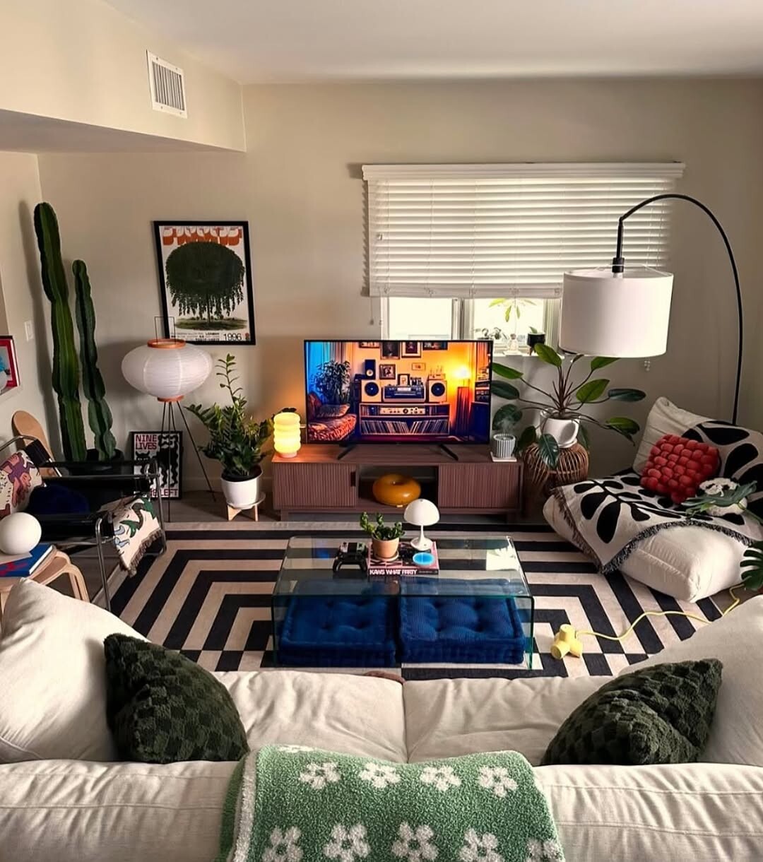 Cozy living room shines. Cream sofa invites relaxation. Green pillows add pop. Striped rug grounds space. Glass coffee table holds colorful decor. Retro TV provides charm. Plants bring life. Modern lighting brightens the room. Light walls feel airy. Artwork frames personality.