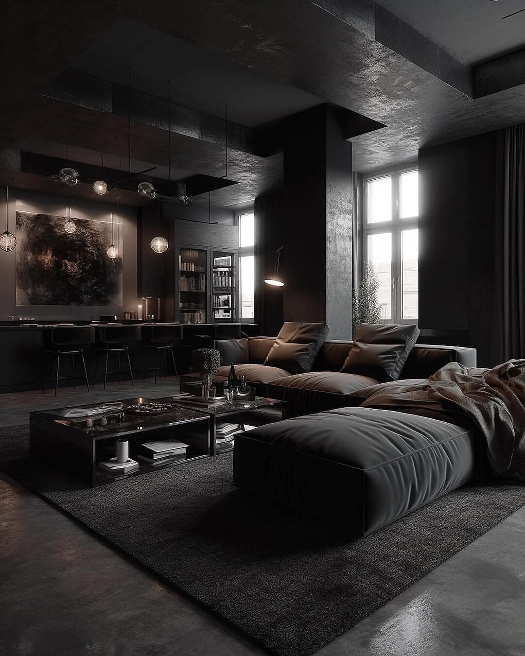 Sleek lines dominate this modern living room. Dark color tones create depth and warmth. Plush sectional sofa invites relaxation. Cushions add comfort and style. A low coffee table, stacked with decor, showcases personal taste. Cozy lounge area features a chunky blanket, perfect for chilly nights. Pendant lighting softens the space, blending with natural light from large windows.