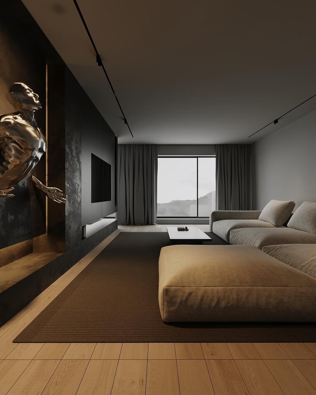 Beige sectional sofa stands out. Soft and inviting, it offers comfort. Minimalism shines through with sleek coffee table. Clean lines create openness. Black wall draws attention. It holds a metallic abstract sculpture, adding depth. Art in design enhances space. Large windows flood room with light. Natural illumination brightens colors. Sheer gray curtains soften sunlight. They frame a beautiful view outside.