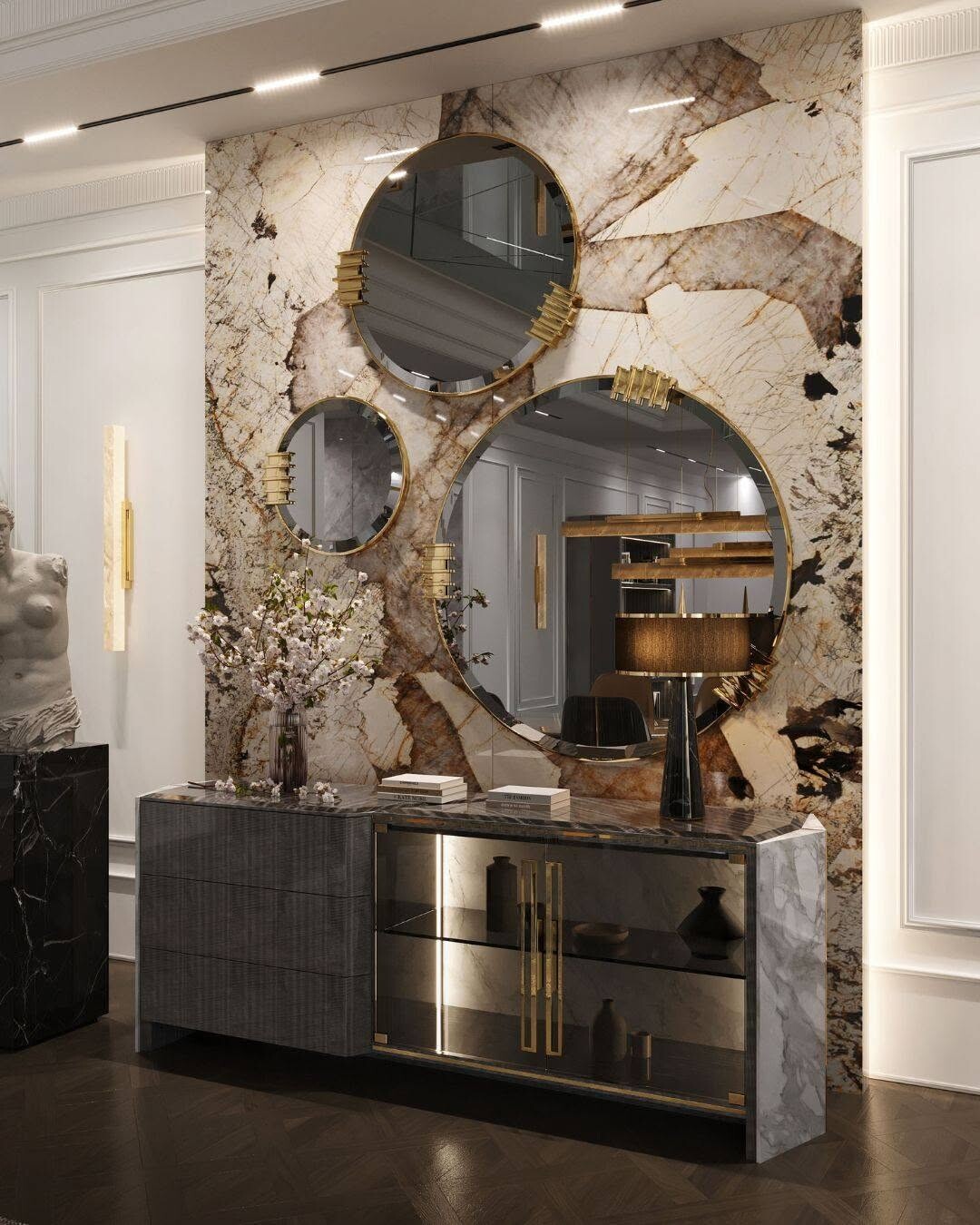 Luxurious interiors create feelings of elegance. This image captures a stunning space. The wall, full of intricate marble patterns, draws attention. Marble, a symbol of wealth, adds sophistication. Three circular mirrors with golden accents reflect light. They bring warmth and depth, enhancing the ambiance.