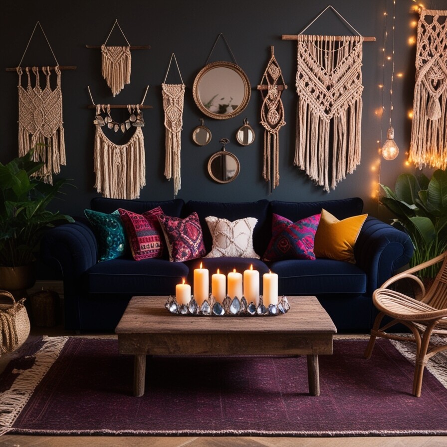 Cozy living room. Stylish and inviting. Navy blue sofa stands out. Colorful pillows add fun. Dark wall creates depth. Macramé hangings bring texture. Circular mirrors reflect light and space. Rustic wooden coffee table anchors room. White candles provide warmth. Glass stones catch the eye. String lights twinkle softly. Lush green plants add life.