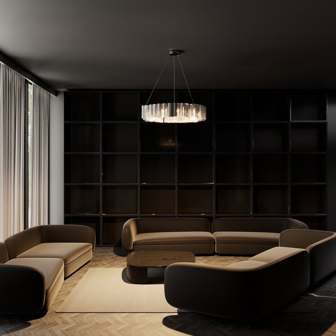 Curved sectional sofa stands out. Soft, muted tones create calmness. Sleek coffee table adds modern flair. Chandelier shines brightly against dark ceiling, bringing elegance to the space. Floor-to-ceiling windows allow natural light to flood in. Sheer curtains soften sunlight, creating a cozy atmosphere. Minimalist black shelving unit keeps clutter away. This design highlights simplicity and functionality.