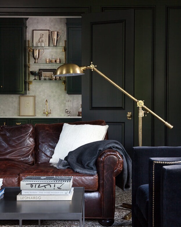 Cozy living spaces blend comfort and style. Rich brown leather sofa stands out. A white cushion adds softness. Dark throw blanket brings warmth. Stylish brass floor lamp provides light. Modern coffee table features artful books, inviting exploration. Dark green walls create depth and drama. Intricate shelving displays decorative items, showcasing personality.