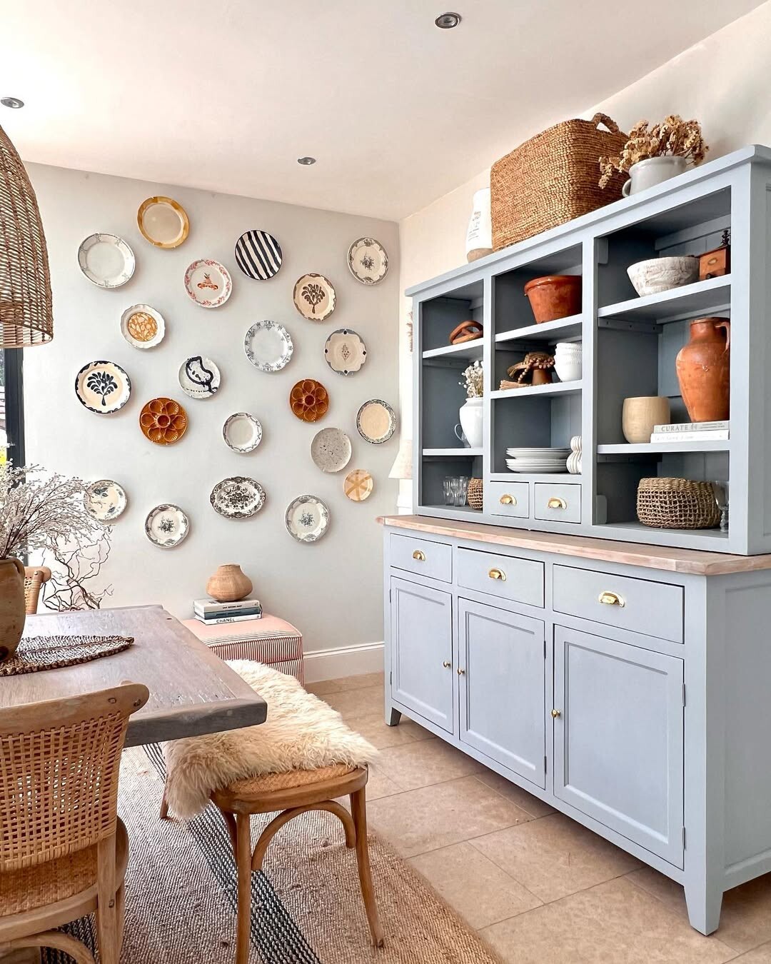 Woven pendant light above brings softness. It creates a welcoming glow. Fresh flowers on the table enhance the natural vibe. These elements work together to create harmony.