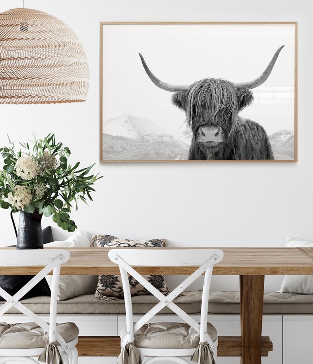 Cozy dining spaces create warmth. This image shines with a wooden table and white chairs. The Highland cow photograph catches the eye. Its shaggy hair and strong horns stand out. This artwork adds character and connects to rustic themes.