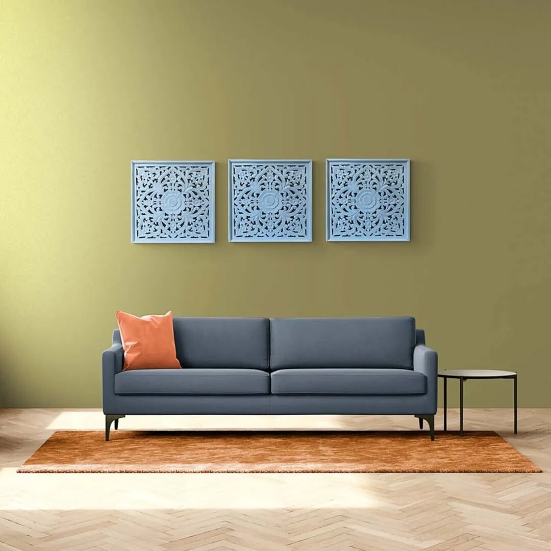 Olive green walls are bold. They add depth and vibrancy. Light blue wall panels offer intricate designs. These details draw the eye and enhance aesthetics.
