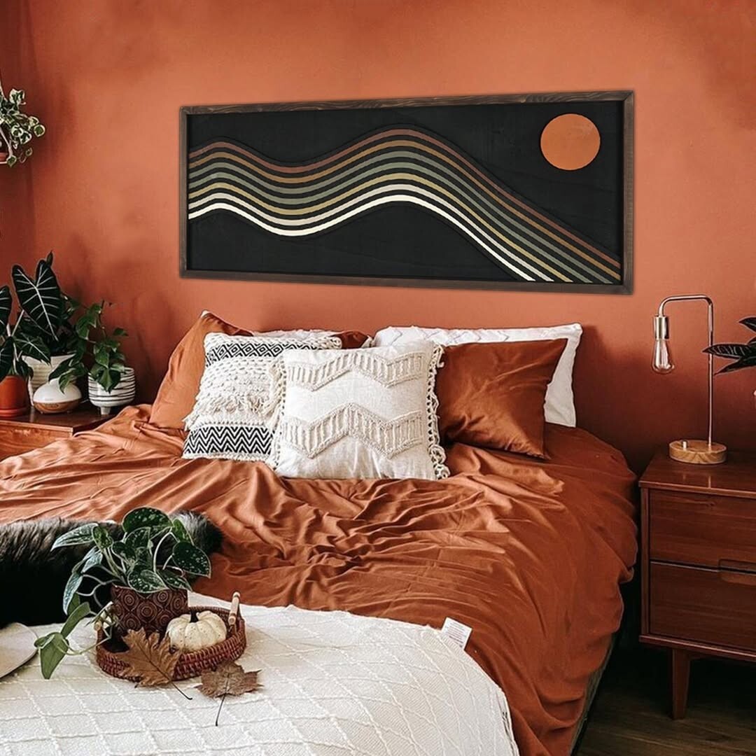 Cozy bedrooms promote relaxation and comfort. Warm terracotta walls create a welcoming atmosphere. The neatly made bed, with an earthy-toned duvet and pillows, invites rest. Textures matter here; they add depth and warmth. Above the bed, abstract artwork of wavy lines and a circle sparks creativity. It contrasts nicely with the softness of bedding.