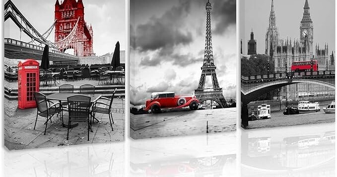 Overall, this triptych showcases cultural landmarks. It highlights history and identity. Red elements create energy. Monochrome serves as a reminder of time's passage. Together, they tell a story of cities and their significance.