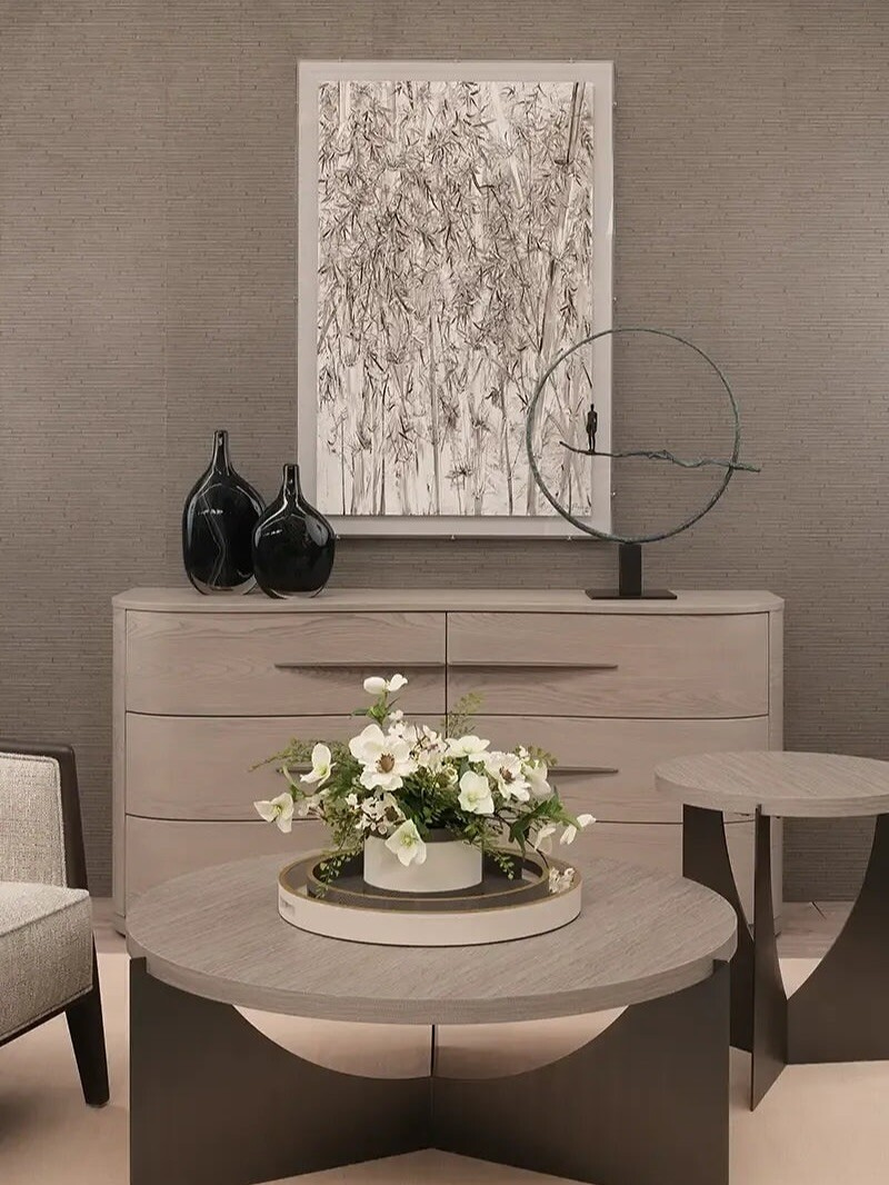 Modern interior design shines here. Light beige wall adds warmth. Textured surfaces create depth. The low-profile wooden dresser stands out. Its clean lines reflect simplicity. Dark ceramic vases bring contrast. They offer elegance without being flashy.