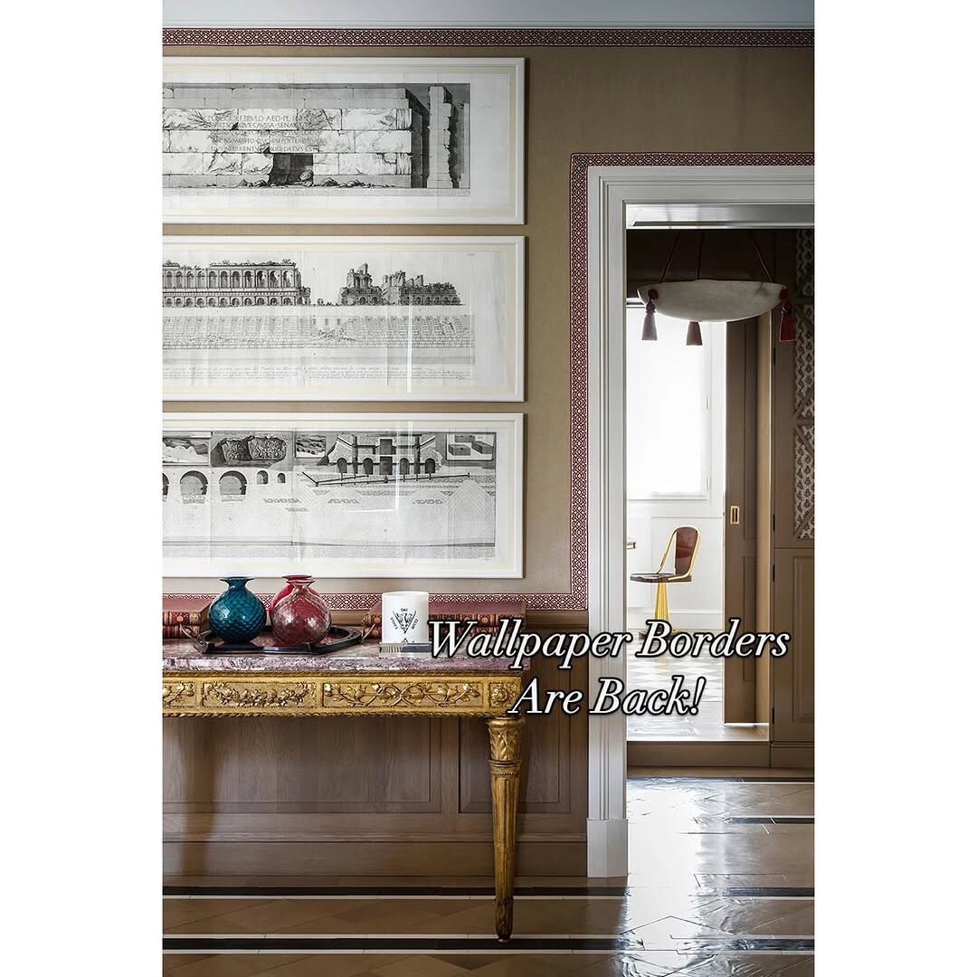 Stylish interiors create feelings of comfort and beauty. A wooden table stands out, decorated with colorful vases and a decorative jar. These elements add warmth and personality to the space. Framed black-and-white artwork on the walls brings a modern touch, contrasting with the rich wood tones. An arched doorway hints at another room, inviting exploration. The bold message, "Wallpaper Borders Are Back!" suggests a revival of classic design trends. Wallpaper borders can enhance a room's decor, offering patterns and textures. They frame spaces beautifully. This image illustrates how blending old and new styles can create harmony, making interiors feel fresh while honoring tradition. Attention to detail matters. Design is all about balance.