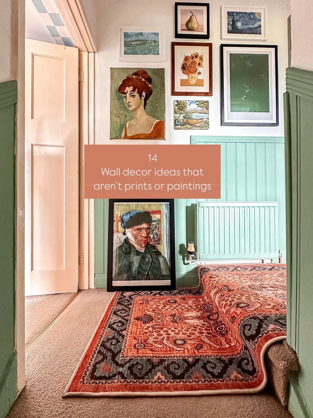 Oriental rug brings warmth. It contrasts beautifully with the wall. Text overlay offers inspiration. Fourteen ideas await exploration. Creative spaces can feel alive. Wall decor isn’t limited to conventional choices.