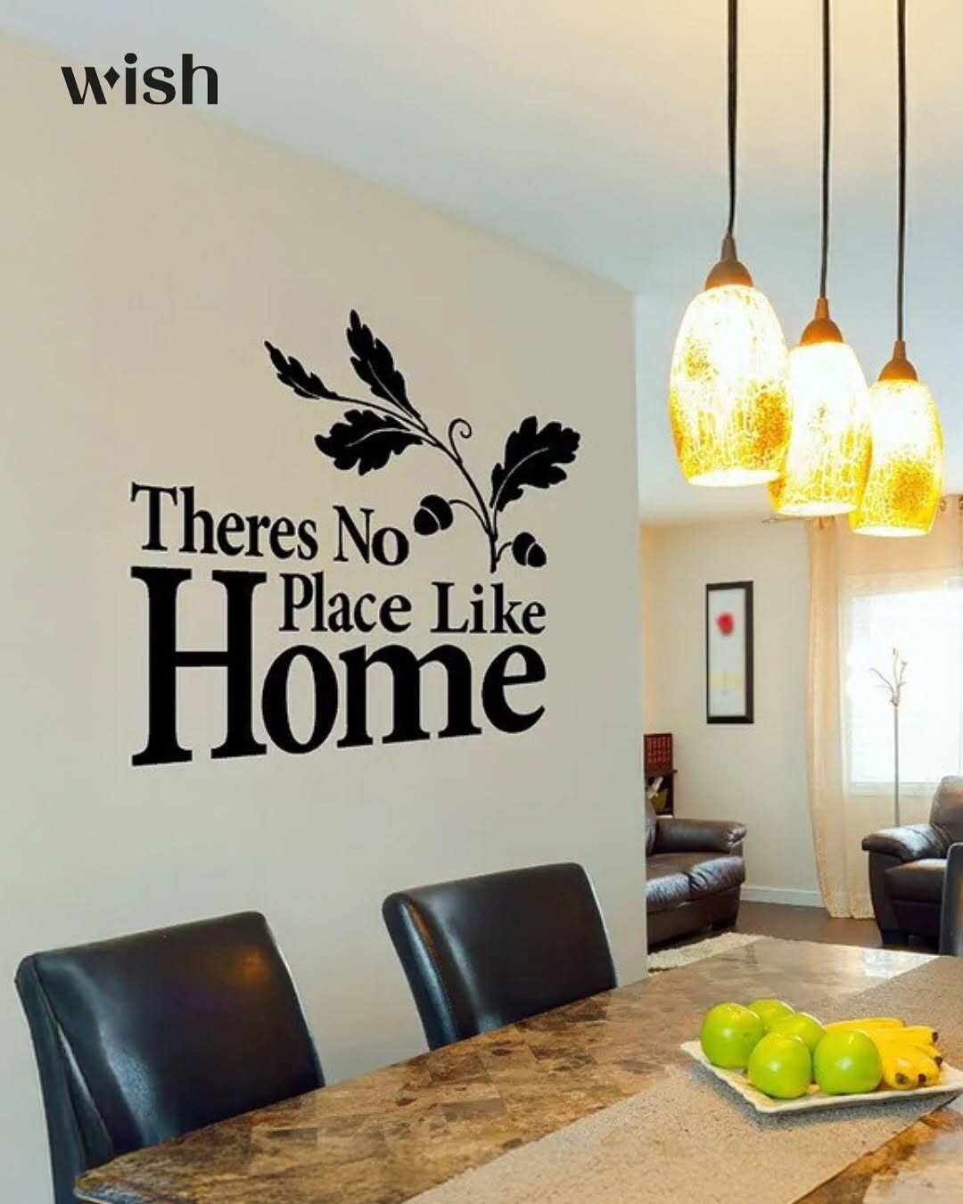 Warm colors dominate the dining area. A wooden table sits center stage, showcasing a bowl of green apples. Apples symbolize health and vitality. They also represent home and comfort. Modern pendant lights hang overhead, casting soft illumination. Light creates a cozy atmosphere, inviting family and friends to gather.