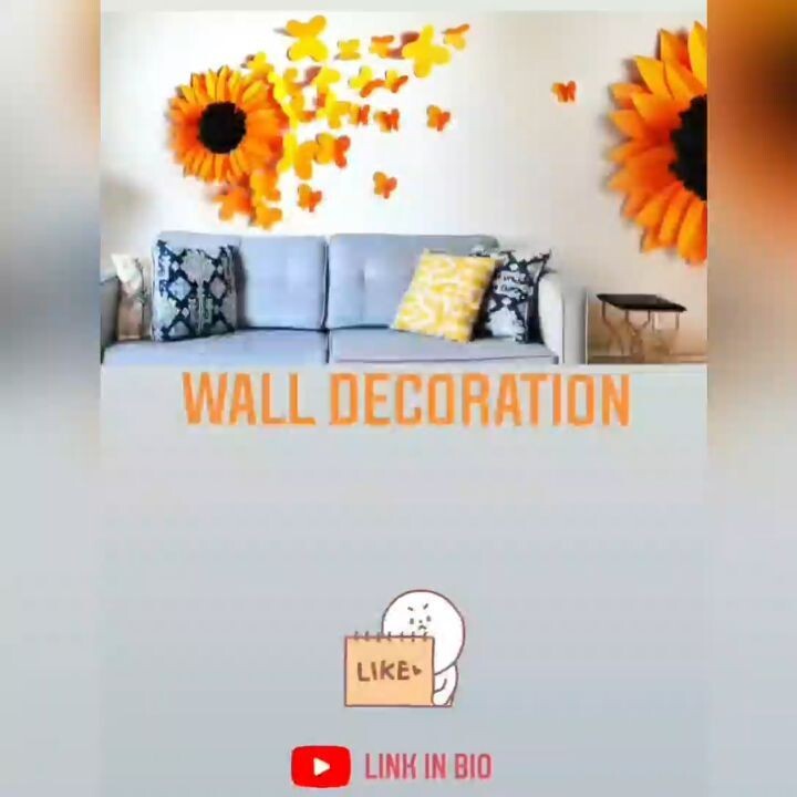Bright and inviting. Stylish living room captures attention. Light gray couch stands out. Colorful cushions add warmth. Sunflower wall art brings nature indoors. These flowers symbolize happiness and positivity. Butterflies flutter across the wall. Shades of yellow and orange create a cheerful atmosphere. This decor choice emphasizes joy and creativity.