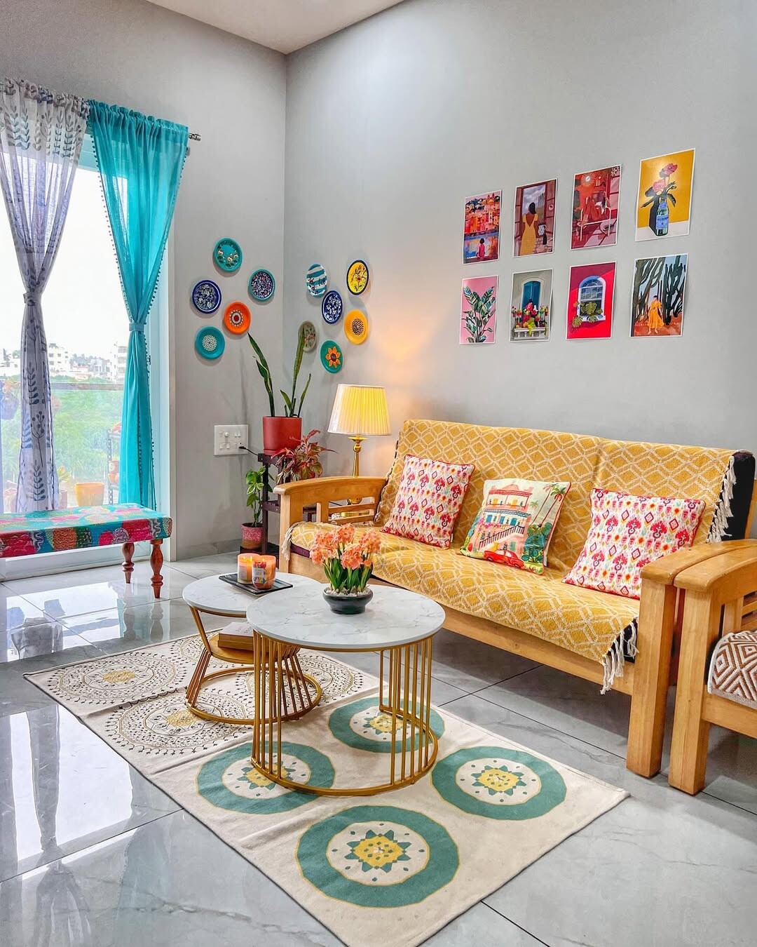 Cozy living rooms often reflect warmth and personality. Bright yellow sofa stands out. Cushions add comfort and color. Marble-topped coffee table brings elegance. Decorative wall plates showcase culture and art. They tell stories. Framed art adds character. Large turquoise curtains let in natural light. Sunlight brightens space, creating a cheerful vibe.