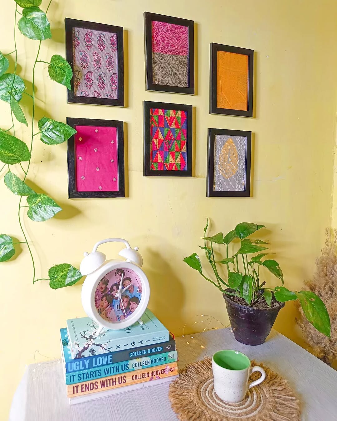 Cozy corners invite comfort and creativity. Light yellow walls create warmth. Six textile art pieces bring color and texture, showcasing different patterns. Each piece tells a story, reflecting cultural influences in textile design.