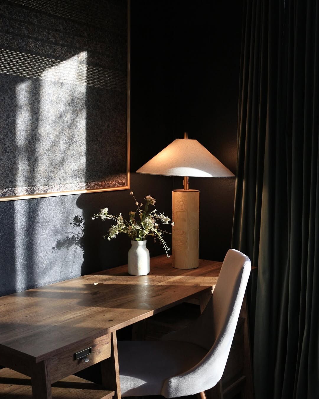 Cozy workspaces inspire creativity and productivity. A wooden desk stands strong. It supports essential tools and ideas. A minimalist white vase holds delicate flowers. Soft colors bring calmness. The softly glowing lamp, with its triangular shade, adds warmth. Light creates a welcoming atmosphere. Shadows play on dark walls, enhancing depth.