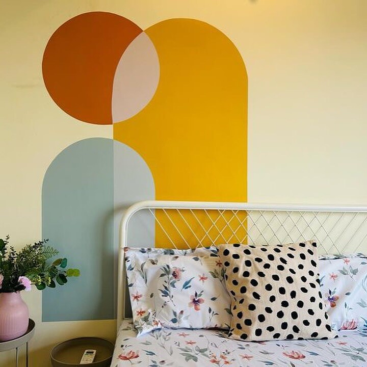 Cozy bedroom design shines here. Floral bedspread brings warmth. Polka dot pillow adds fun. Soft yellow wall creates a sunny feel. Geometric shapes in oranges, greens, and blues offer a modern touch. These colors work together, promoting calmness and joy.