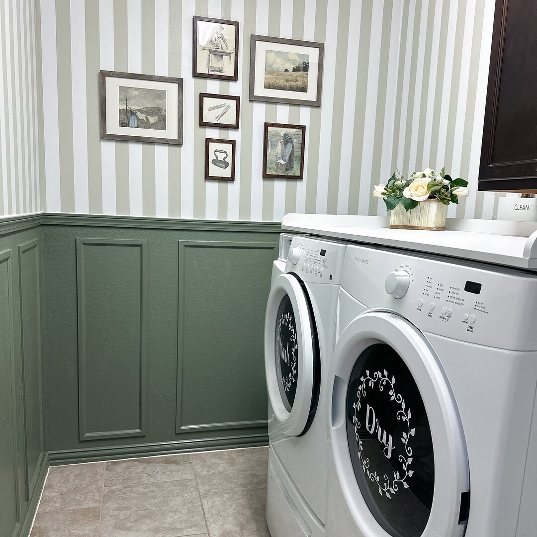 Laundry rooms often go unnoticed. Yet, they hold potential for style and function. This image showcases a well-organized space. Elegant white washing machines stand out. Decorative "Dry" stickers add charm. Green wainscoting contrasts nicely with light gray and white striped wallpaper. Such color choices create a fresh, inviting atmosphere.