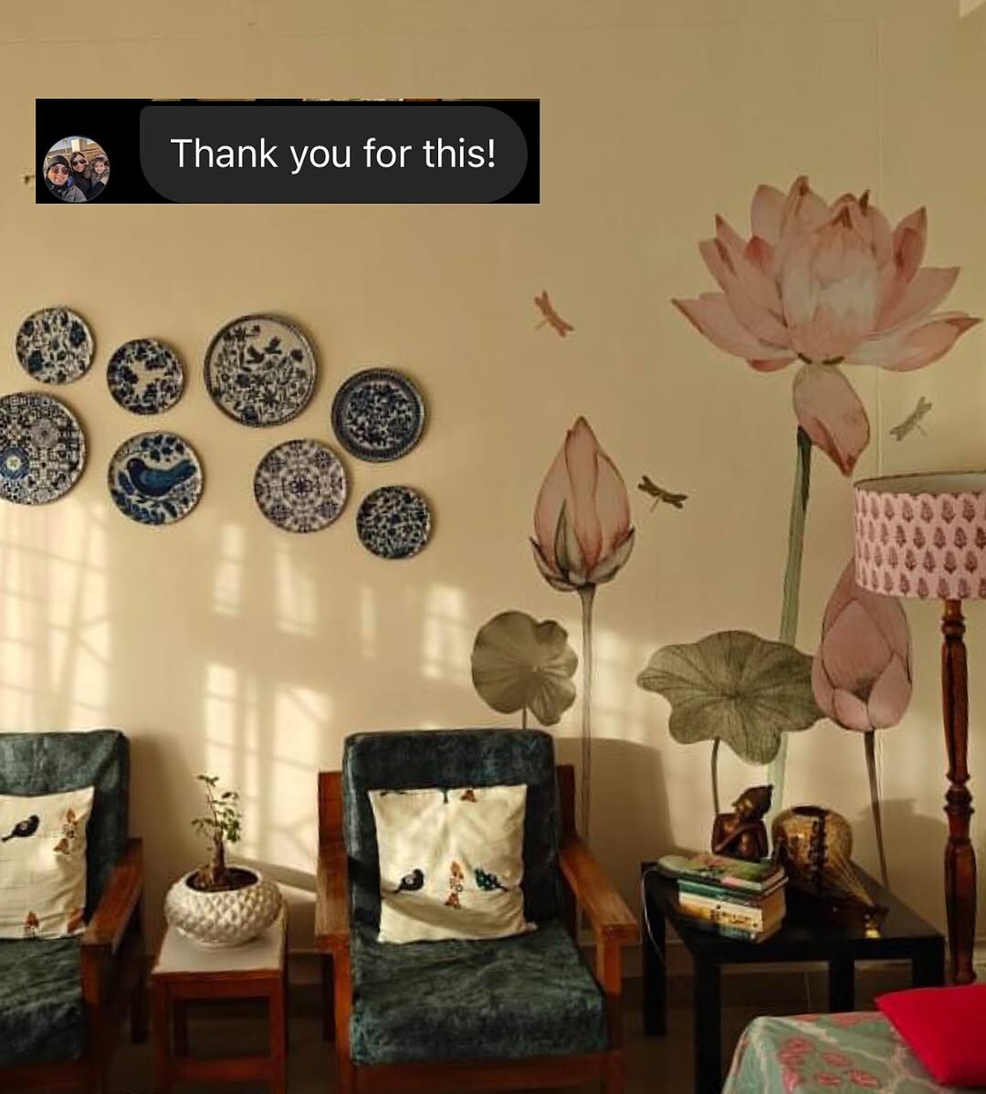 Cozy indoor spaces bring warmth and comfort. Two upholstered chairs invite relaxation. Decorative pillows add color and personality. A vibrant wall showcases blue and white plates. This arrangement highlights cultural significance, as these plates often symbolize heritage and craftsmanship. Floral wall decals enhance the inviting atmosphere, merging nature with art.