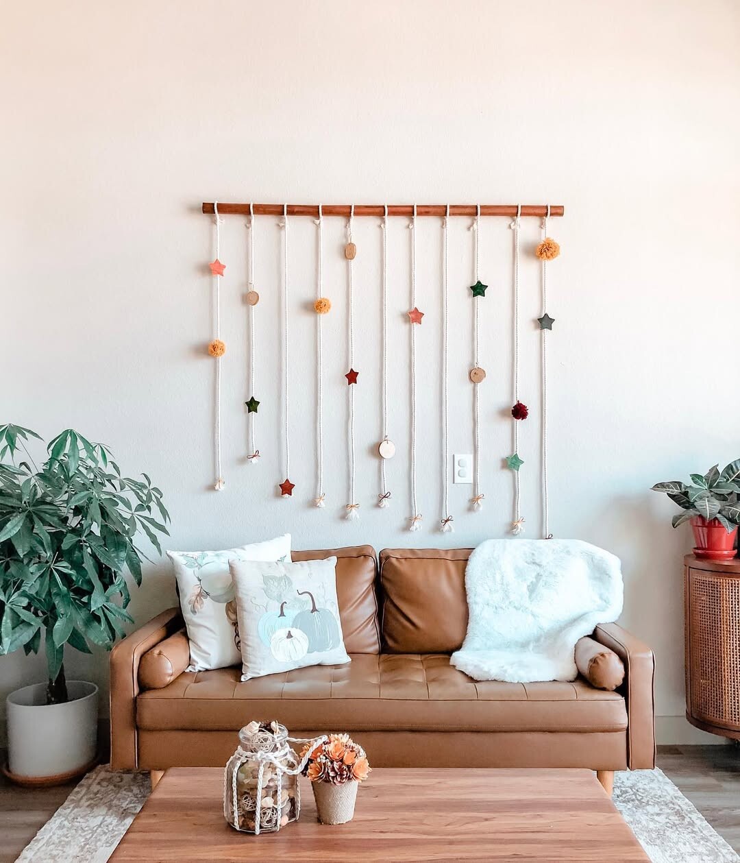 Cozy living rooms create warmth and comfort. Brown leather sofa stands out. Soft pillows and a white throw invite relaxation. Bright yarn pom-poms and star shapes on the wall add charm. These elements reflect a playful, creative spirit.