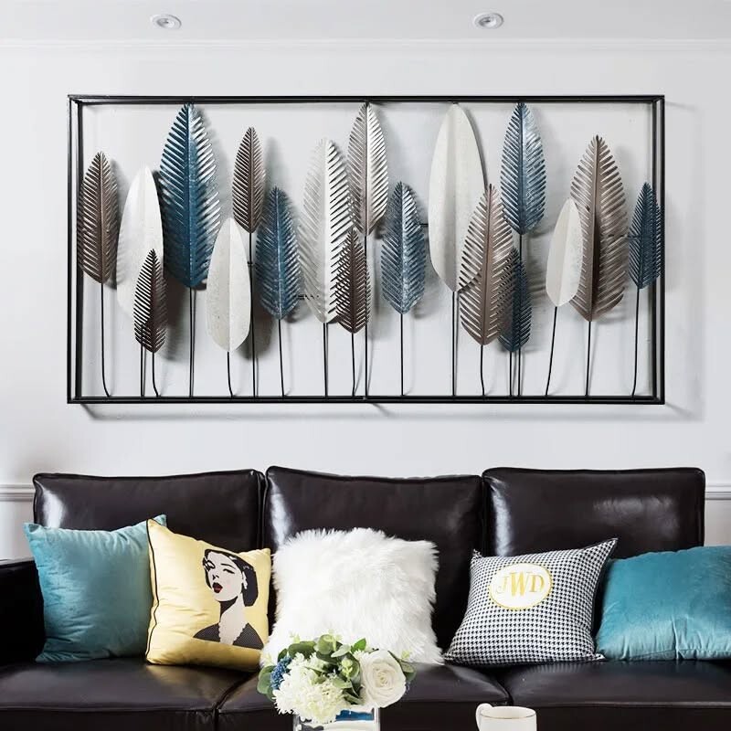 Stylish living room shines. Rich brown leather sofa stands out. Decorative pillows add color and patterns. Each pillow tells a story. Behind, wall decor features metallic leaves. Shades of blue, white, and brown create harmony. This blend offers a modern feel.