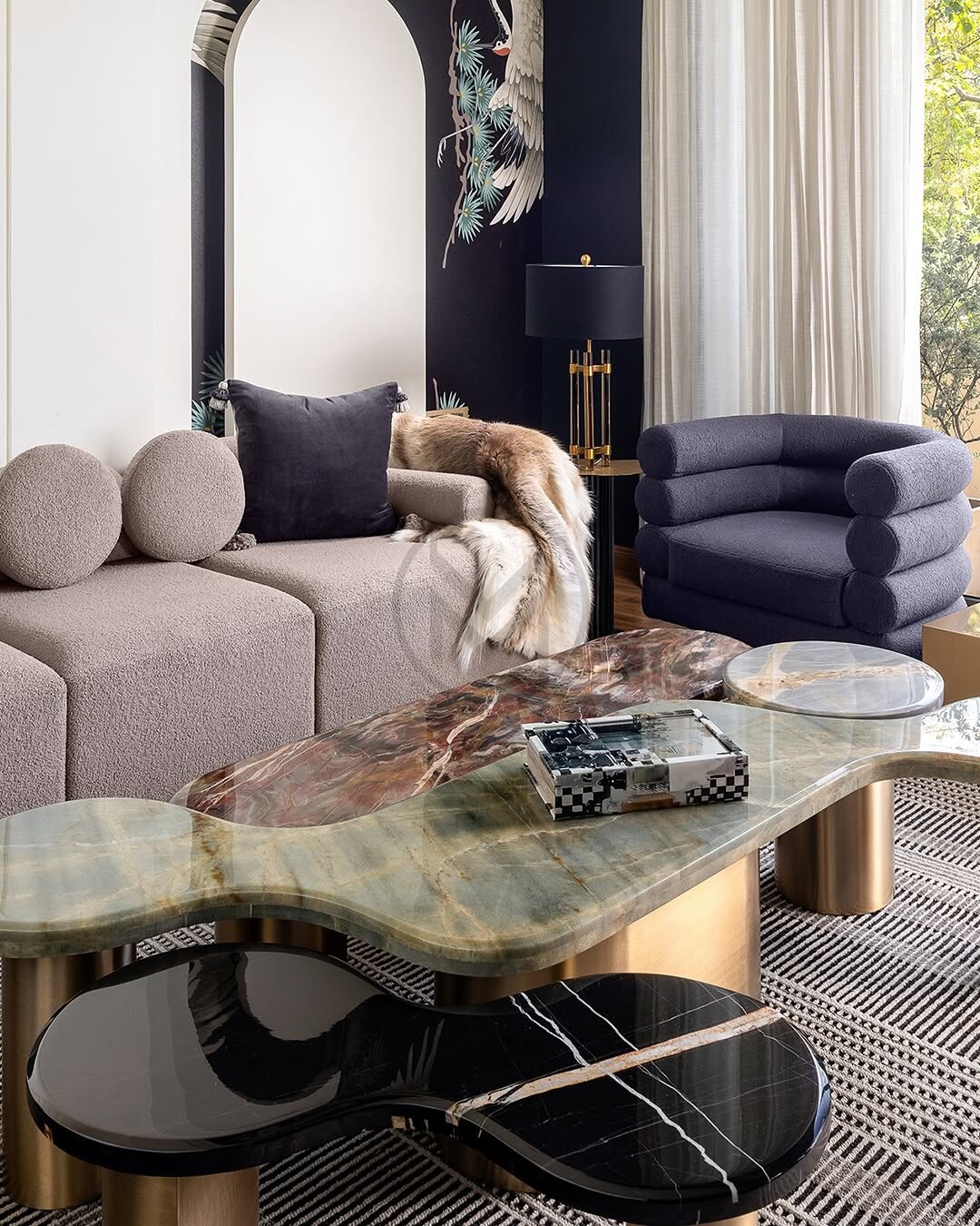 Stylish living room shines. Neutral tones dominate. Textured sofa invites comfort. Round cushions add softness. Coffee table stands out. Its organic shape blends glass and stone. A plush, deep blue armchair adds a pop of color. Botanical wallpaper connects nature indoors. Elegant curtains frame windows, creating flow. A stylish lamp casts a warm glow.
