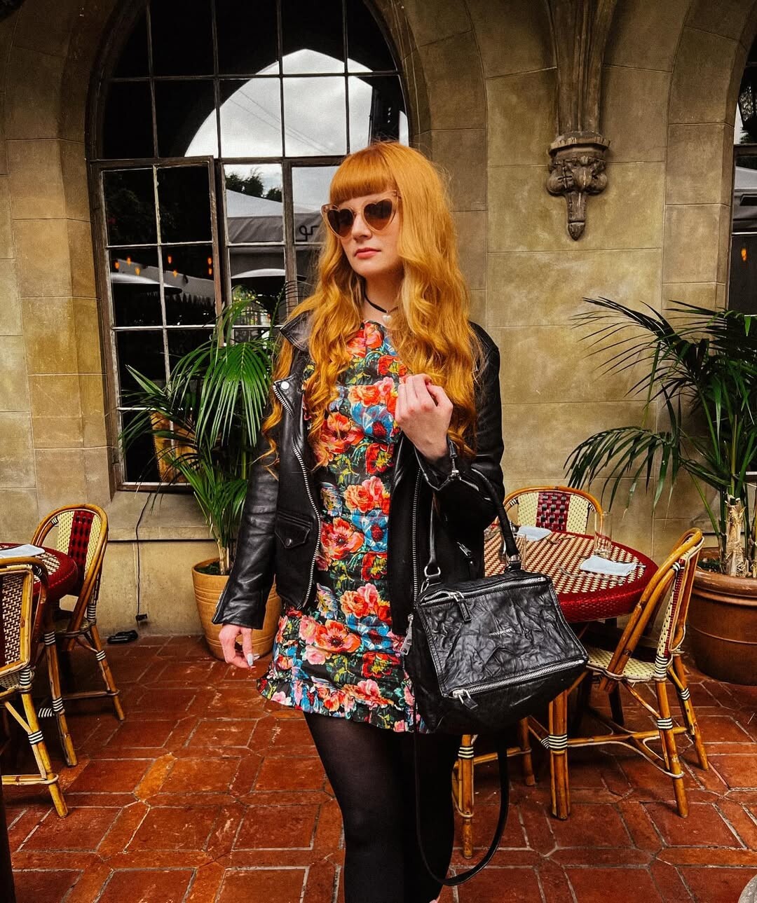 Young woman stands out. Long, wavy red hair catches light. Floral dress bursts with color. Bold choice! Black leather jacket adds edge. Sunglasses exude confidence. Handbag completes the look.